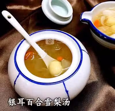 材料:銀耳 1朵,雪梨 1個,百合干 15克,枸杞 30粒,蓮子 10粒
