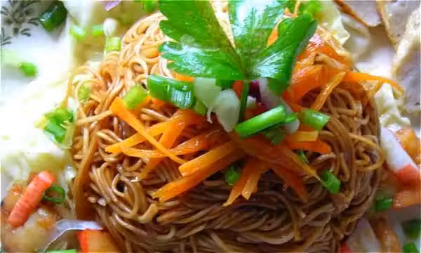 筒仔面2 個、蒜碎、魚片、蝦、紅蘿蔔、包菜