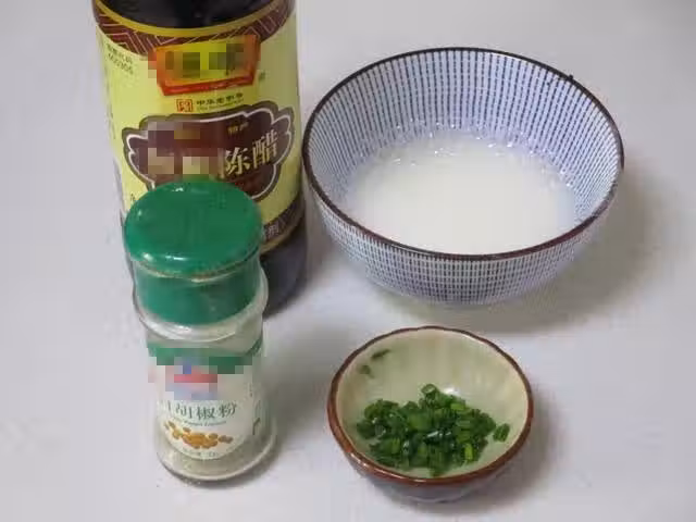 備好陳醋,白鬍椒粉,蔥花,和水澱粉(用生粉加入少許清水攪拌至溶化就是水澱粉)