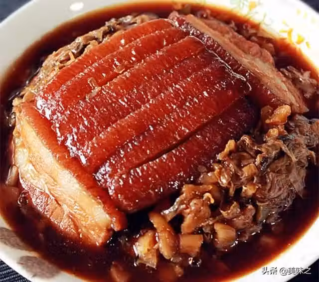 15、湯汁重新回鍋,用澱粉水勾簿茨,淋在梅菜扣肉表面,完工!