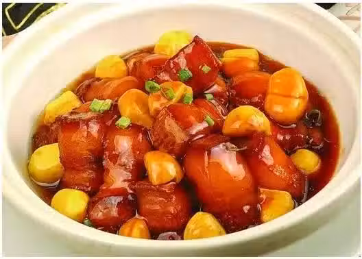 五花肉500克,板栗20克,姜適量,老抽2湯匙,料酒1湯匙,食鹽少許,冰糖10克,小蔥1根。