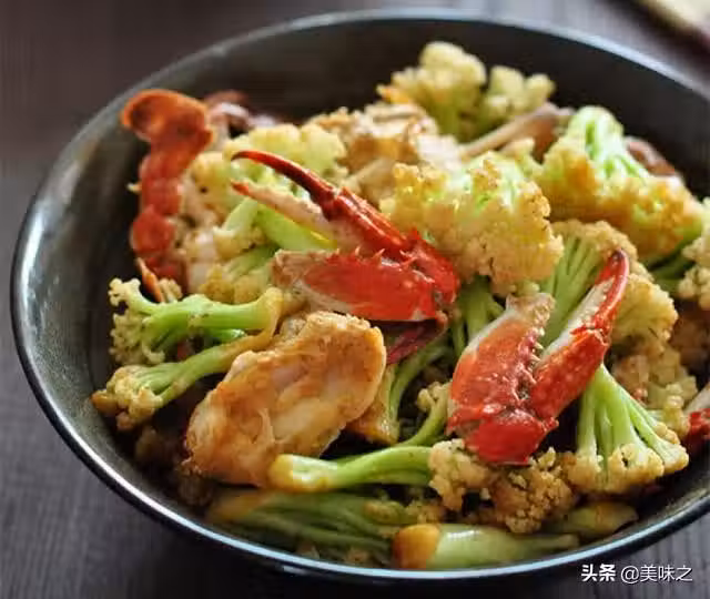 9、待菜花和蟹熟時加適量鹽翻炒均勻出鍋。