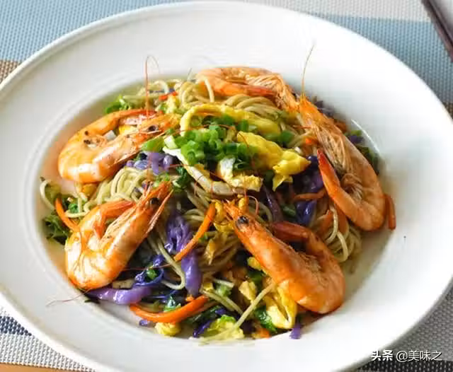味千拉麵1包、紫甘藍幾片、雞蛋2個、姜4片、蔥半根、油適量、生抽少許、蝦300克、生菜半個、胡蘿蔔半根、蒜4瓣、鹽適量、糖適量、料酒適量。