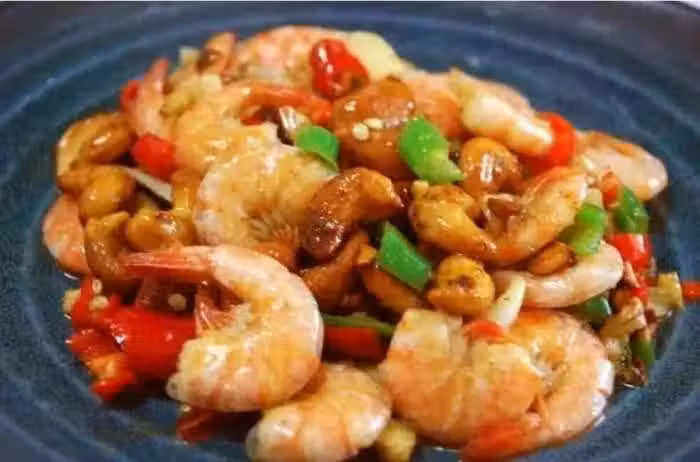 原料:腰果,蝦仁,姜,蒜,胡椒粉,生抽,青椒紅椒