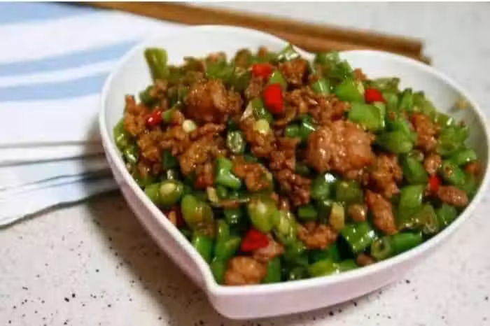 4003 5、豆角熟之後,加入之前炒好的肉沫,加適量的鹽、雞精,翻炒均勻出鍋
