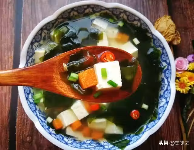 胡蘿蔔4片、海帶芽一點、豆腐適量、鹽適量、雞精適量、胡椒粉適量、香油適量、姜適量、小米椒適量、蔥適量。