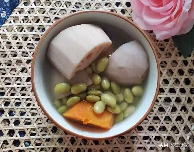 蓮藕1節、胡蘿蔔1條、毛豆300克、姜3片、鹽少許、油少許、香菇粉少許。