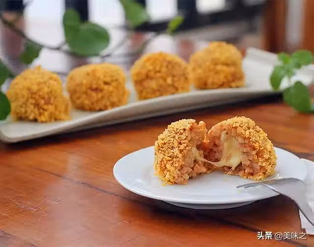 5、用米飯蓋上之後在麵包糠里滾一下,依次做好所有飯糰。