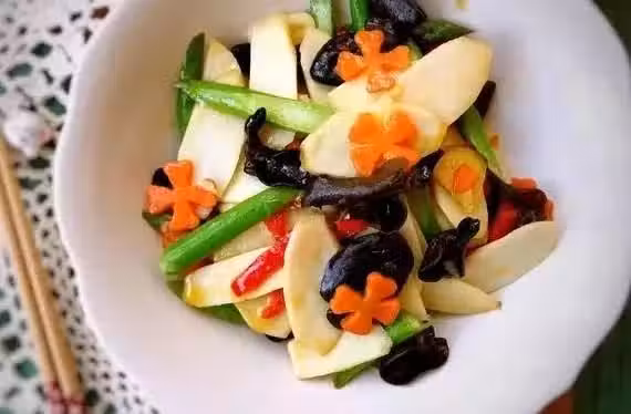 2、鍋內倒入少許油,放入山藥爆炒,再放入胡蘿蔔、黑木耳、紅椒繼續翻炒,最後放入蘆筍和素高湯、鹽,快速炒至出鍋。