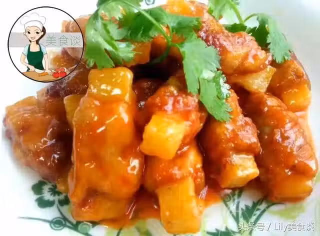 3、油鍋燒熱,水,醋,糖,老抽,料酒比例:5:4:3:2:1,調好的糖醋汁炒至濃稠,加入培根土豆卷翻炒入味即可,