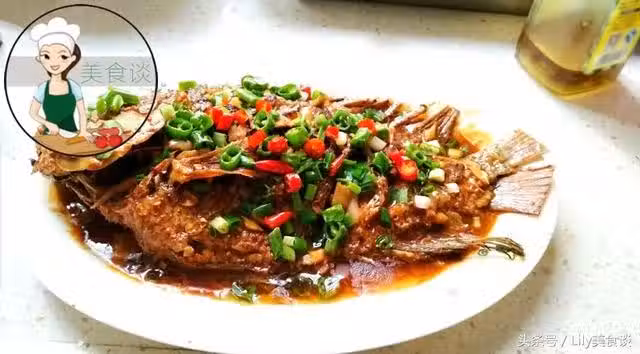 4、將醬汁炒至濃郁後淋在油炸好的魚上。最後撒點蔥花、小米辣即可上桌。