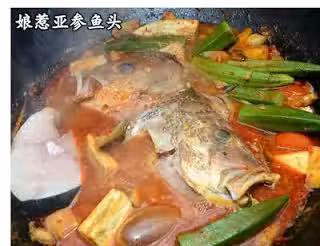 材料:紅棗魚頭 1個,金楓葉 適量,羊角豆 (切塊) 適量,茄子(切塊) 適量,薑花,黃梨(切片)適量,番茄,羅望子汁 1杯,鹽 少許,糖 少許