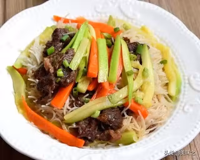 7、把米粉、牛肉和蔬菜都炒熟撒上蔥粒即可。