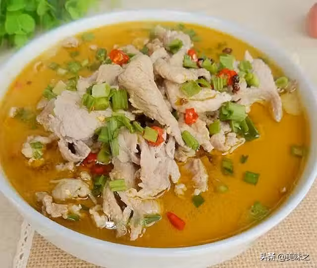 豬裡脊肉400克、豆芽100克、蛋清1隻、黑胡椒半茶匙、木薯澱粉1.5茶匙、食用油適量、白菜100克、紅椒5克、鹽1茶匙、雞精半茶匙、骨湯適量。