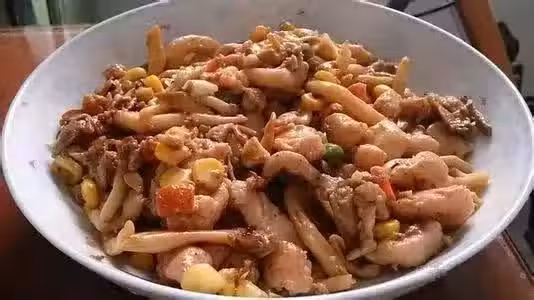 雞脯肉切丁,蘑菇洗淨切好,切點辣椒,放鹽爆炒幾分鐘即可