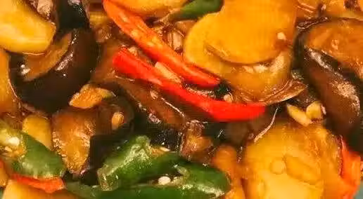 4. 然後下入土豆,茄子翻炒會,炒出水分後,然後倒入醬汁,翻炒會,再加入1小碗水,最後放進去最容易變軟的青椒,快速翻炒入味。