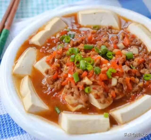 白玉嫩豆腐、肉糜、香蔥、生薑、泡椒、澱粉、白糖、蒜瓣、醬油、香醋、高湯、蔥白。