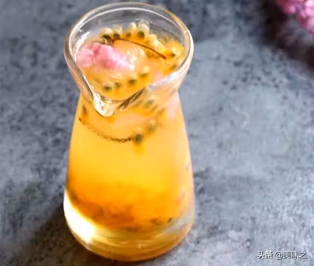 3、百香果切開、用勺子挖出果肉、放入杯中。