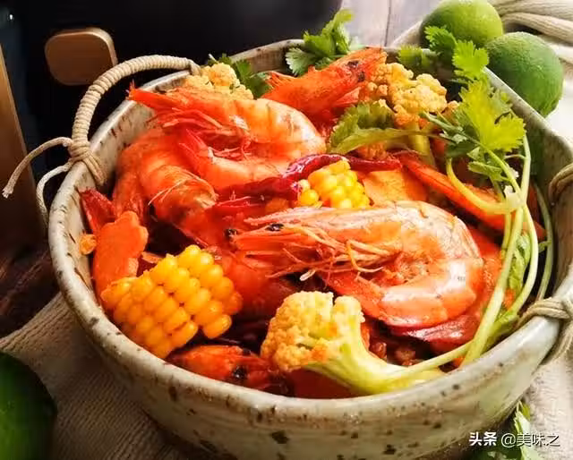 蝦、蔥、辣椒、橄欖油、花菜、玉米、青檸檬、姜、花椒、鹽、胡蘿蔔。