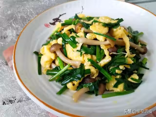【韭菜蘑菇炒雞蛋】所需材料:韭菜200克、蟹味菇150克、雞蛋3個、油鹽適量、