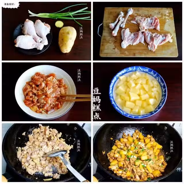 ①、雞腿肉去了骨是很容易熟的,所以土豆塊不要切得太大,別燉太長時間把雞肉煮老了。