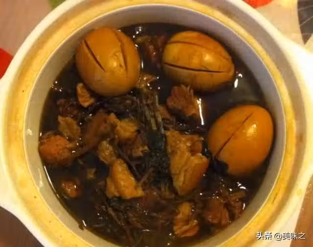 前臀尖500g、梅乾菜60g、雞蛋3個、蔥段適量、薑片適量、燉肉料1包、料酒適量、鹽適量、糖適量、老抽適量。