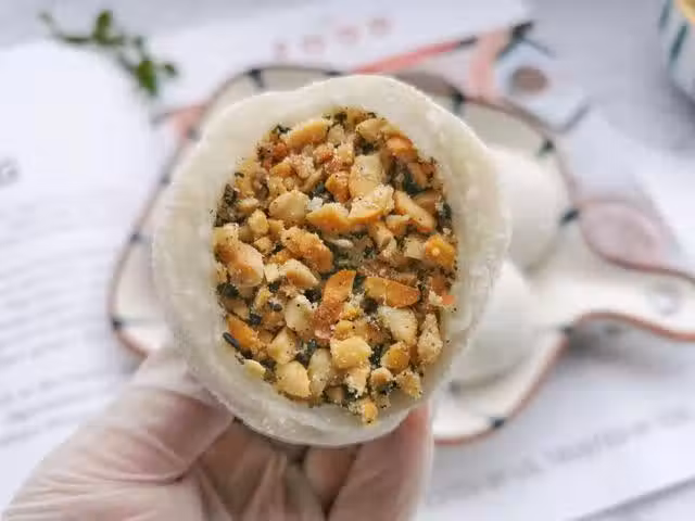 主要食材:糯米粉160克、玉米澱粉40克、白糖15克(糯米麵團),清水200克,花生100克,黑白芝麻20克,白糖10克(拌餡兒),熟糯米粉50克。