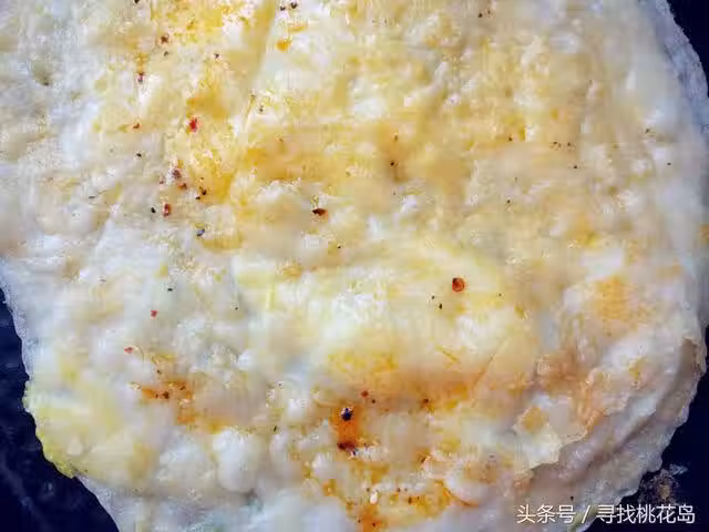 4. 把餅再次翻面,讓有雞蛋的一面朝下,繼續小火。這時在餅的表面刷甜麵醬、芝麻醬和辣椒醬的混合物,也可以根據個人口味,改成用沙拉醬或千島醬。