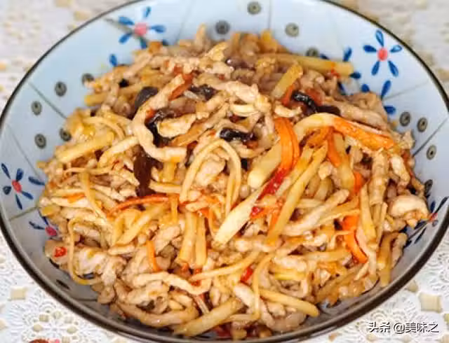 7、放入胡蘿蔔絲翻炒至變軟,加入筍絲和木耳絲繼續翻炒。