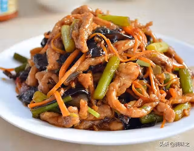 豬裡脊100克、蒜薹150克、胡蘿蔔半根、木耳50克、香蔥50克、姜30克、蒜30克、生抽1.5勺、醋1.5勺、糖1勺、料酒1勺、老抽1/3勺、小蘇打2克、鹽適量、味精適量、澱粉2.5勺。