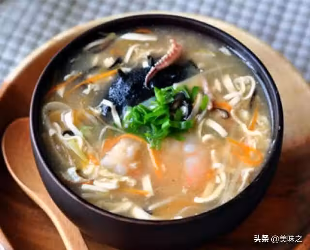 豆腐適量、香菜適量、香蔥適量、胡蘿蔔適量、筍適量、木耳適量、香菇適量、大蔥適量、雞蛋適量、水澱粉適量、魷魚適量、蝦仁適量、海參適量、雞湯800ml、白鬍椒粉2小勺、陳醋3小勺、鹽1小勺、生抽1小勺、花生油1大勺、白糖少許、香油數滴。