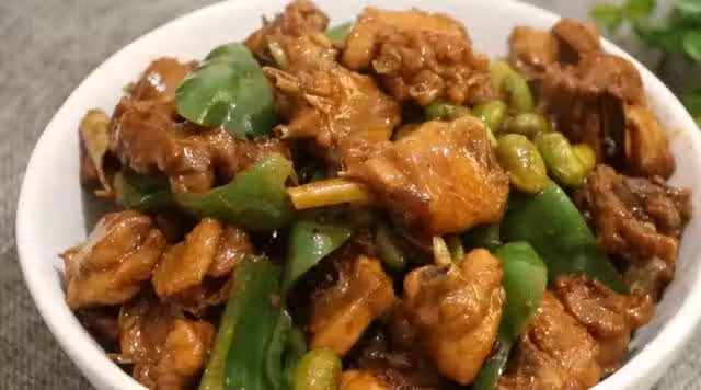 準備食材:雞、毛豆、青椒、生抽、冰糖、鹽、料酒、