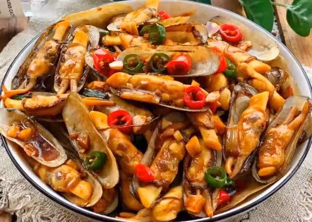 (3)鍋中熱油爆香小蔥蒜末,放入蟶子翻炒片刻,加入適量的料酒、生抽、老抽、白砂糖、食鹽大火翻炒入味。