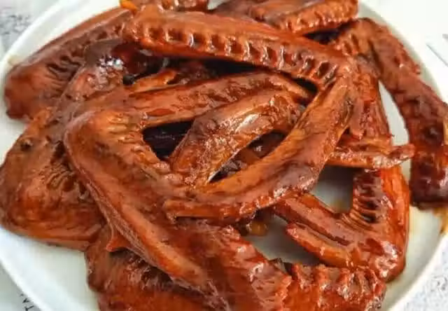 (3)鍋中熱油放入冰糖炒出糖色,加入鴨翅翻炒上色,倒入生抽兩勺和老抽一勺翻炒片刻。