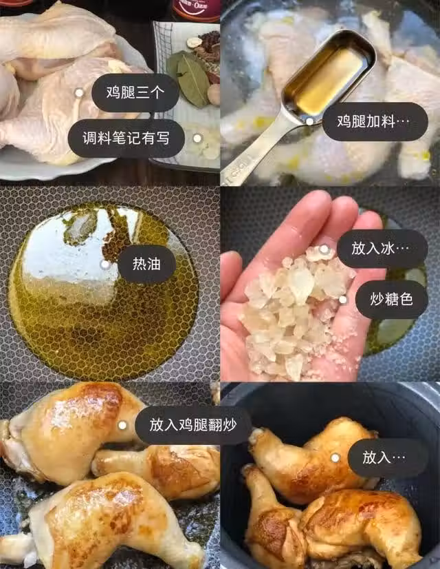 (2)雞腿洗凈放入鍋中加入料酒焯水5分鐘後撈出瀝干水分備用,鍋中熱油放入冰糖炒出糖色,放入雞腿翻炒至雞腿兩面上色。