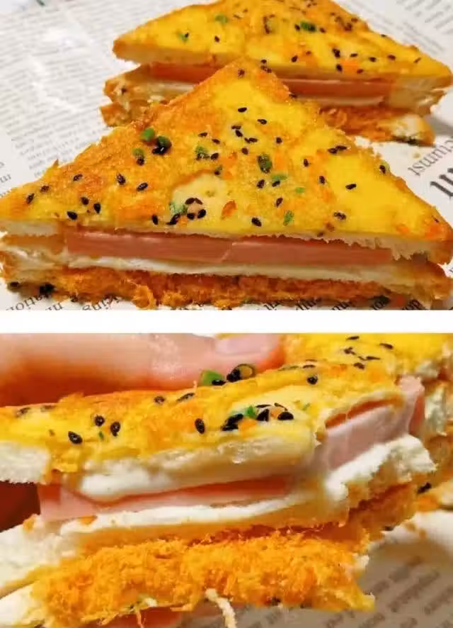 (3)熱鍋刷油放入三明治,轉小火慢煎至金黃,最後保鮮膜固定即可享受美味早餐啦營養豐富孩子非常喜歡吃✅