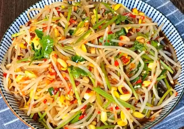 (4)將料汁淋在豆芽上,加入適量的香菜、小蔥、香油拌勻即可,開胃下飯脆爽可口大人小孩都喜歡吃!