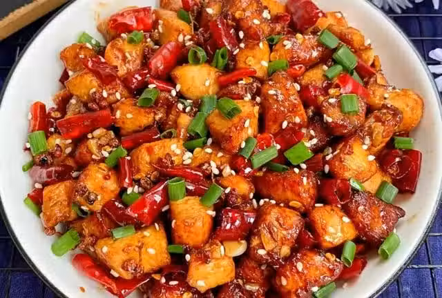 (4)鍋底留油放入蒜末、花椒、干辣椒煸炒出香味,倒入雞肉丁大火翻炒片刻。