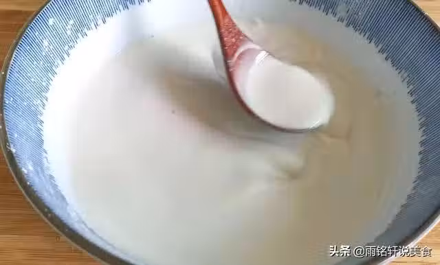 第一步:碗中倒入100克粘米粉,60克紅薯澱粉,40克玉米澱粉,倒入340克溫水,邊倒邊用勺子攪拌均勻,把它攪拌至無顆粒的稀糊狀備用。傳統的九層糕是全部用粘米粉,為了使它更Q彈軟糯我加了紅薯粉和玉米澱粉,你也可以只加其中的一種。