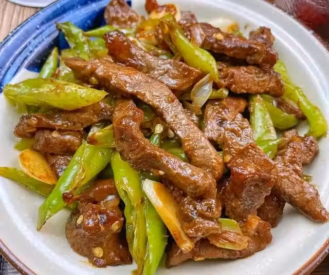 (5)下入牛肉和杭椒,大火翻炒均勻至食材入味熟透關火出鍋裝盤,色香味俱全好吃又下飯,大人小孩都喜歡吃!