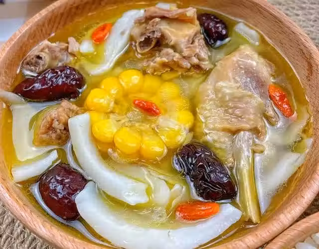 (1)玉米洗凈切段,椰子肉切條,雞肉洗凈切塊,生薑去皮切片,紅棗枸杞洗凈備用。