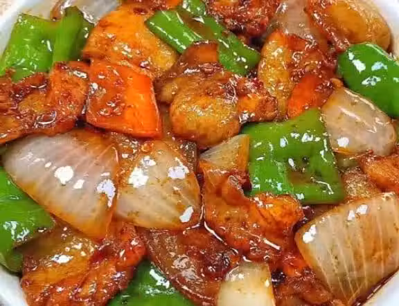 (5)再放入青椒、洋蔥、胡蘿蔔翻炒至斷生,再放入五花肉,再倒入調好的料汁,大火翻炒均勻,至食材入味,大火收汁。