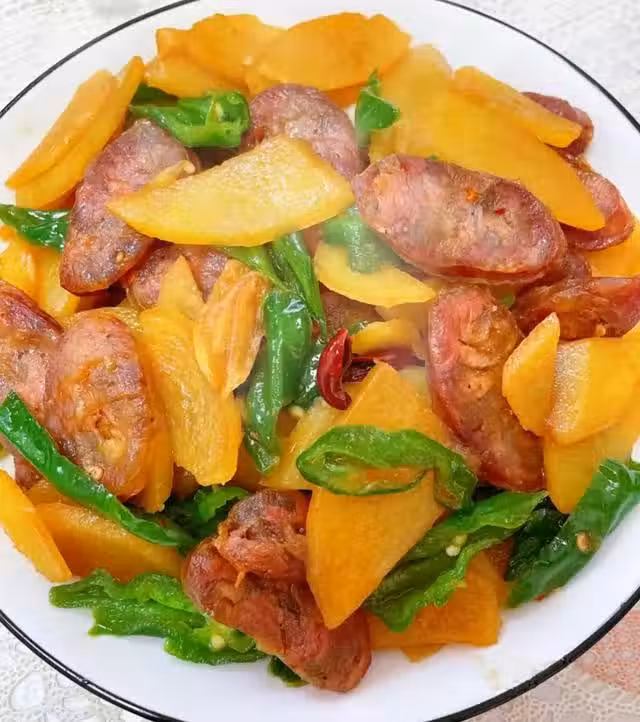 (1)土豆洗凈去皮切片,青椒洗凈去蒂去籽切塊,臘腸切片,小米椒切圈,蒜瓣切末。