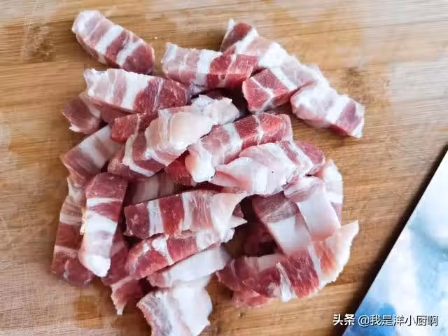 步驟二:起鍋加入適量的冷水,將切好的五花肉放入鍋中,加入一勺料酒。將肉塊煮至變色之後撈起來再清洗乾淨備用。
