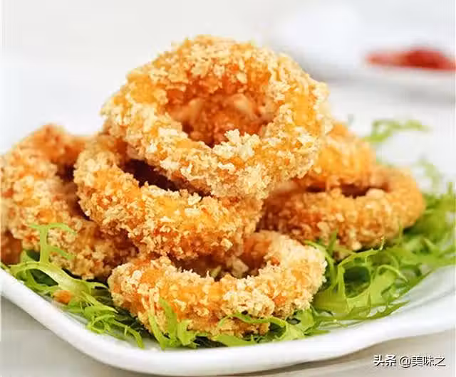 7、油溫燒至6、7成熱,放入魷魚圈轉中小火炸至金黃色即可。