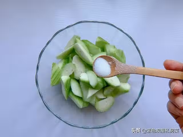 1.絲瓜去皮切滾刀塊,放一小勺鹽拌均勻,這樣做的好處是絲瓜不會變色不會發黑,這一步不能省。