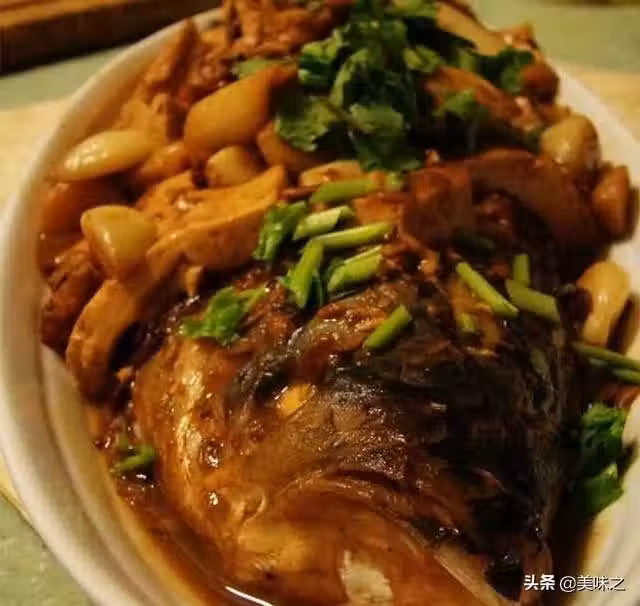 5、把稀釋的豆瓣醬水水澆在魚頭豆腐上,再來兩勺醬油,燒開了,燜上10分鐘,出鍋。