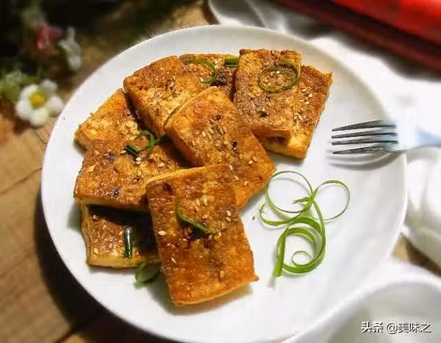 4、用一個小叉子,輕輕在豆腐塊上面扎些小孔,讓醬汁更好地滲入豆腐內,這樣豆腐會很入味。