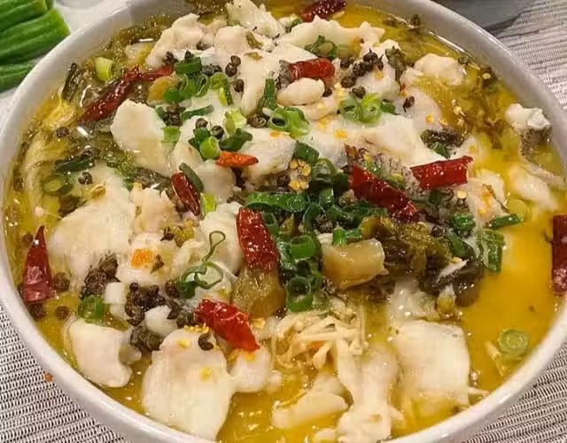 (6)配料:再放入酸菜,撒上適量的白芝麻、干辣椒、花椒、小蔥點綴。
