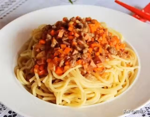 意面、洋蔥、胡蘿蔔、火腿、牛肉、西紅柿、番茄醬、黑胡椒粉、鹽、橄欖油。